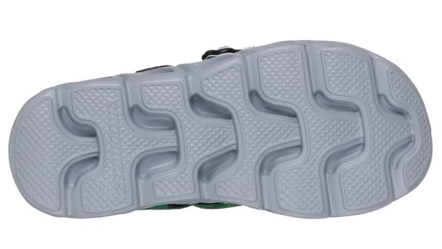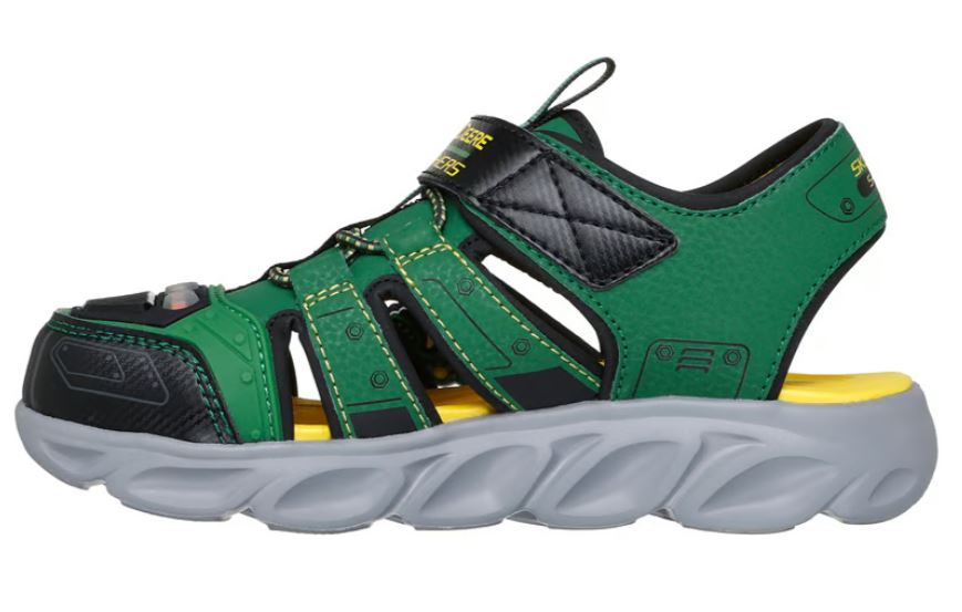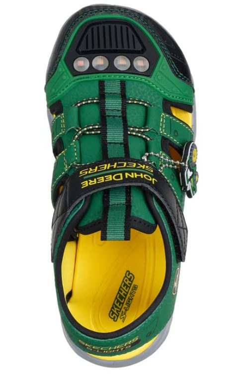 Get ready for sunny-weather adventures wearing Skechers Foamies® x John Deere: Hypno-Splash. This lighted fisherman sandal features a synthetic upper with a tractor themed design and matching charm, Skechers adaptive closure, and a contoured cushioned footbed.
