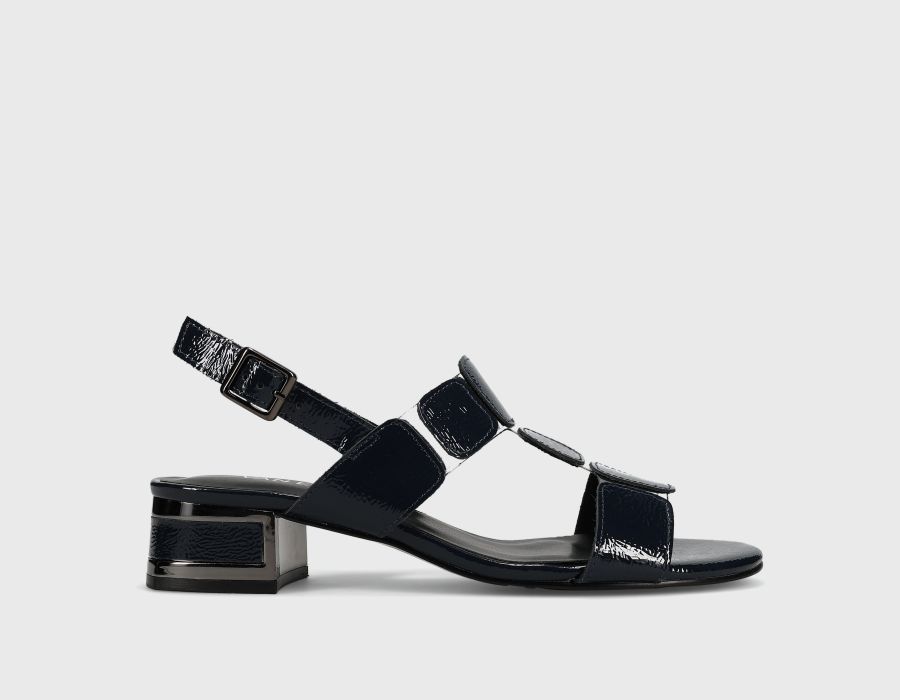 T-strap sandal with illusion vinyl. Buckle with hidden elastic insert. Padded insole. 1.5 inch covered block heel with metallic trim.